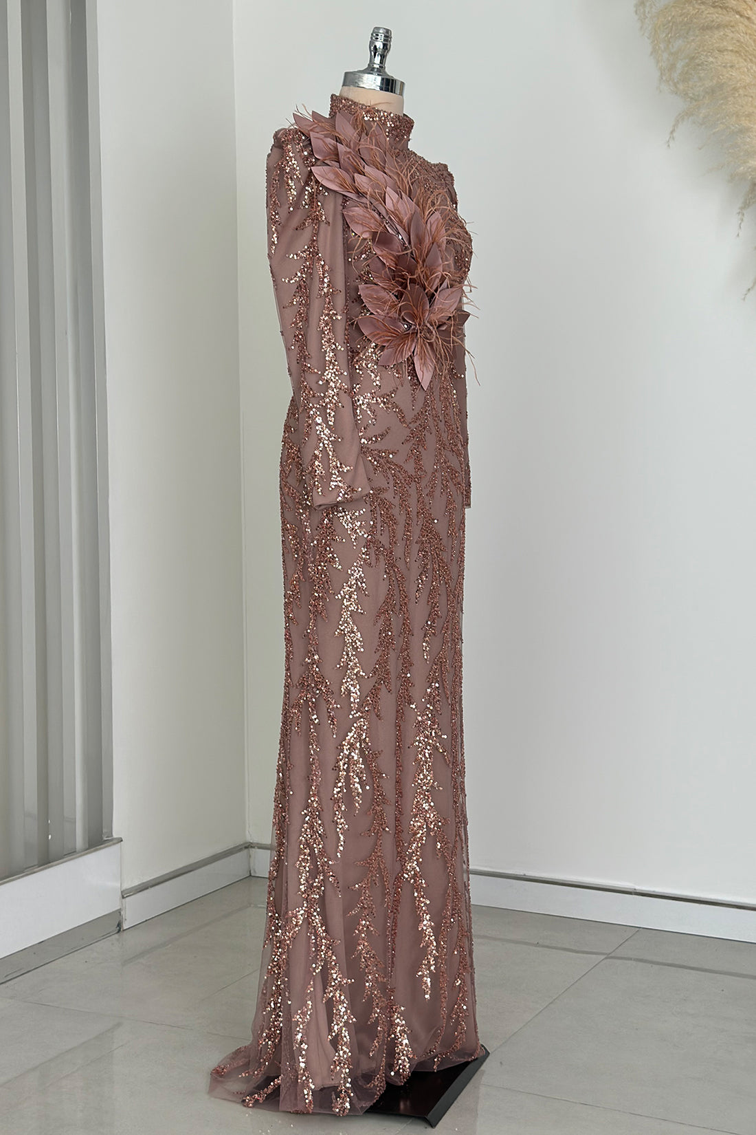 Yaprak Detay İşlemeli Amara Abiye - Bronz