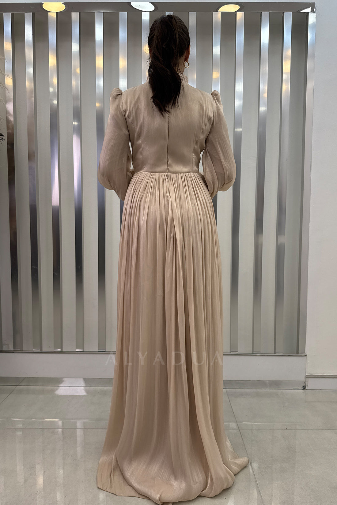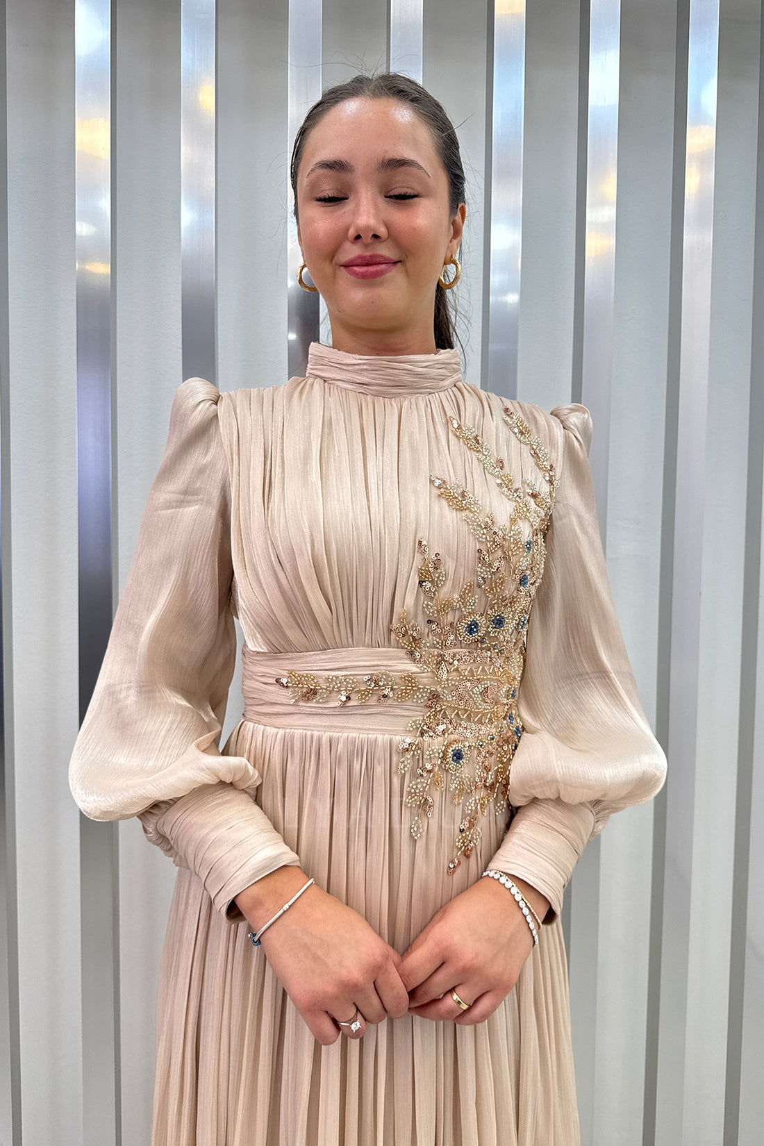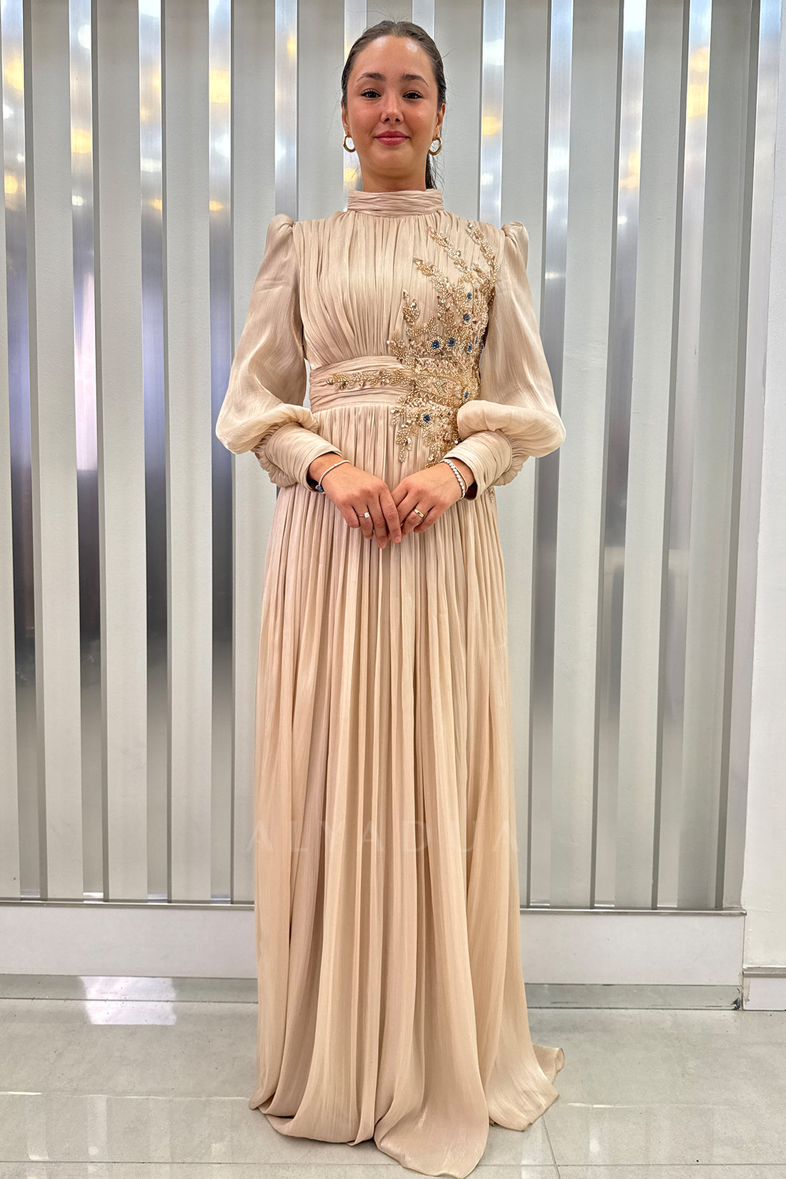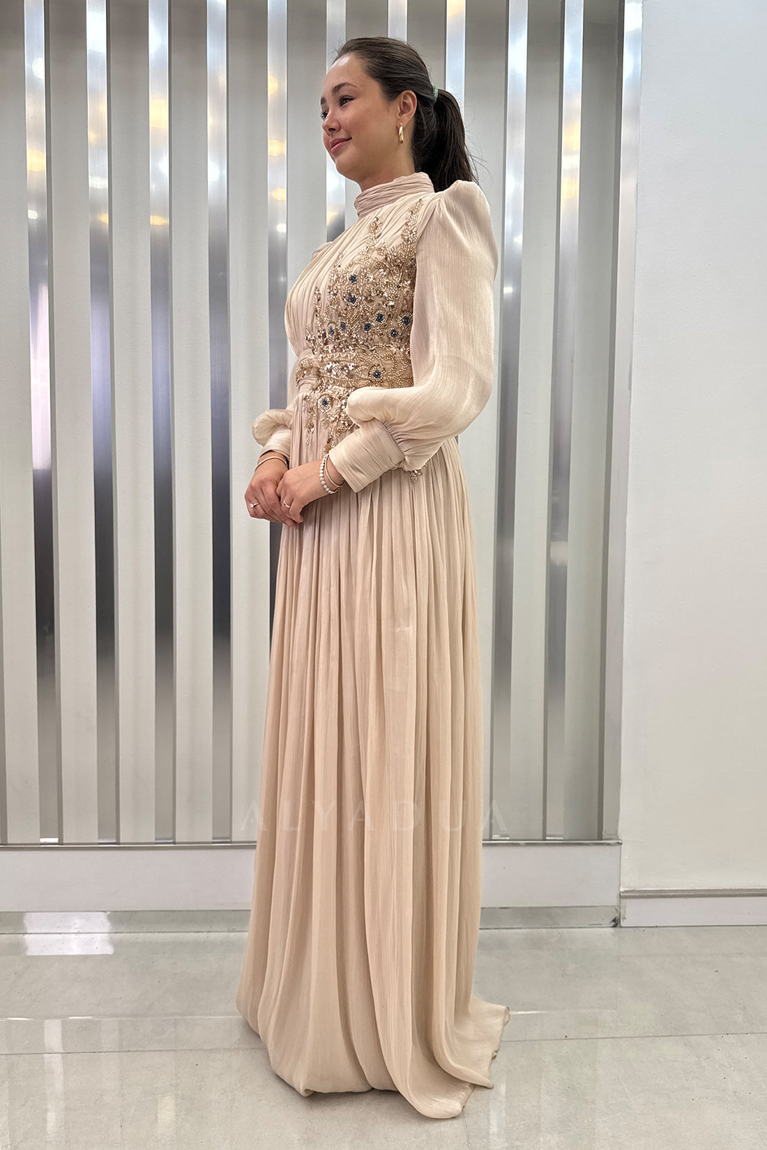 Beli Boncuk İşlemeli Şifon Astoria Abiye - Gold