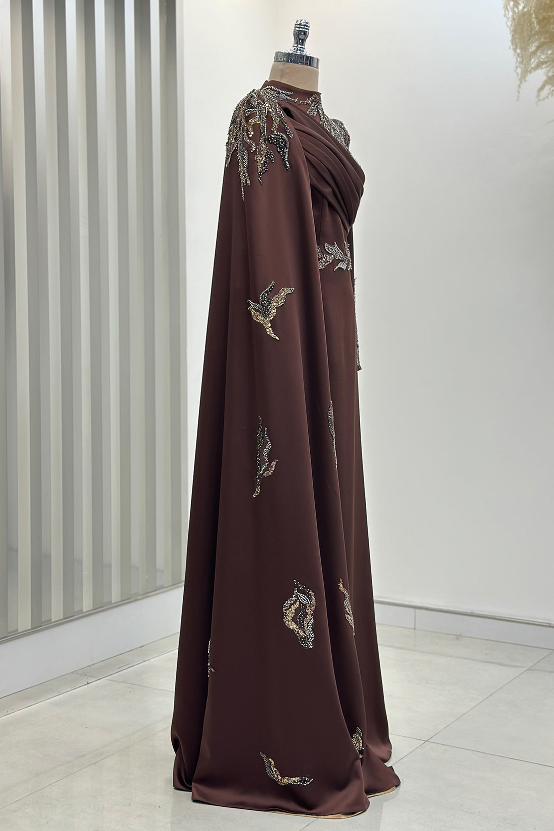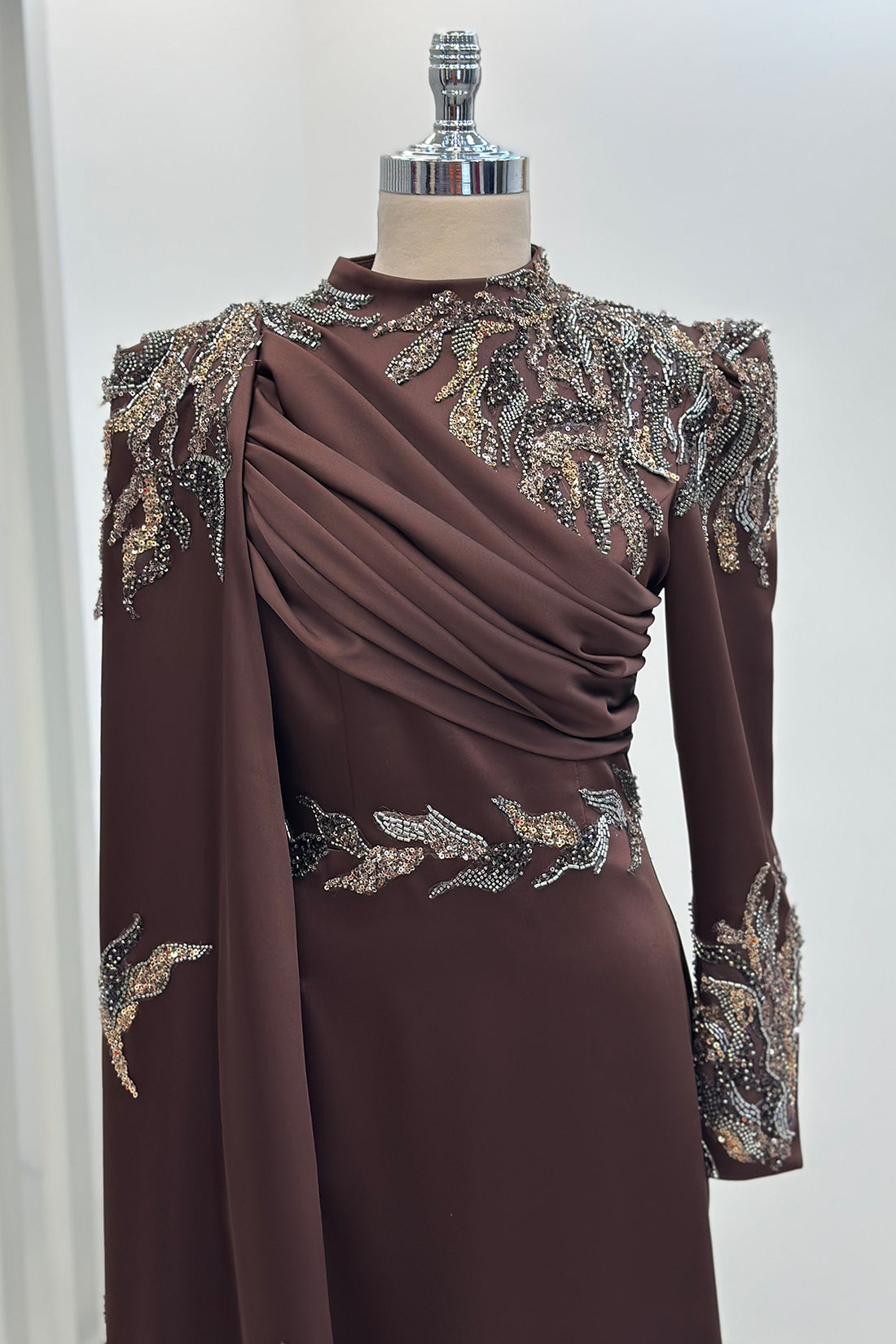 Pelerinli Drape Detay Saten Garnili Abiye - Kahve