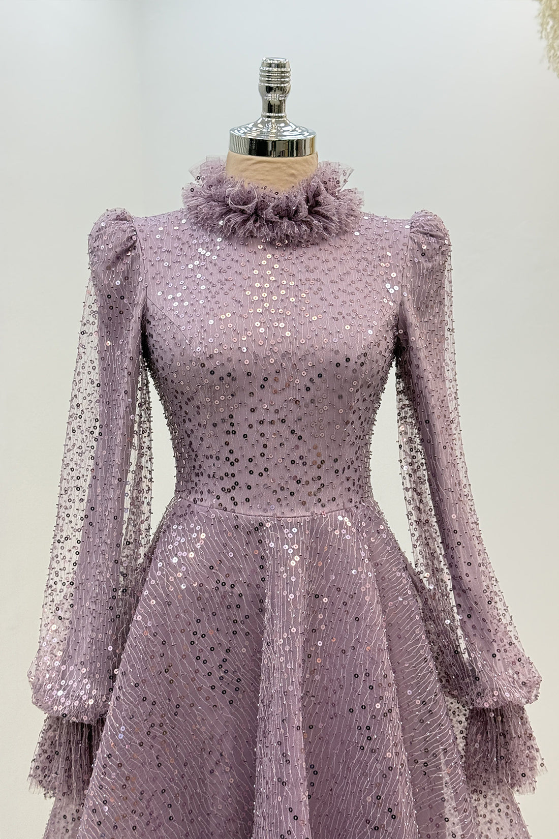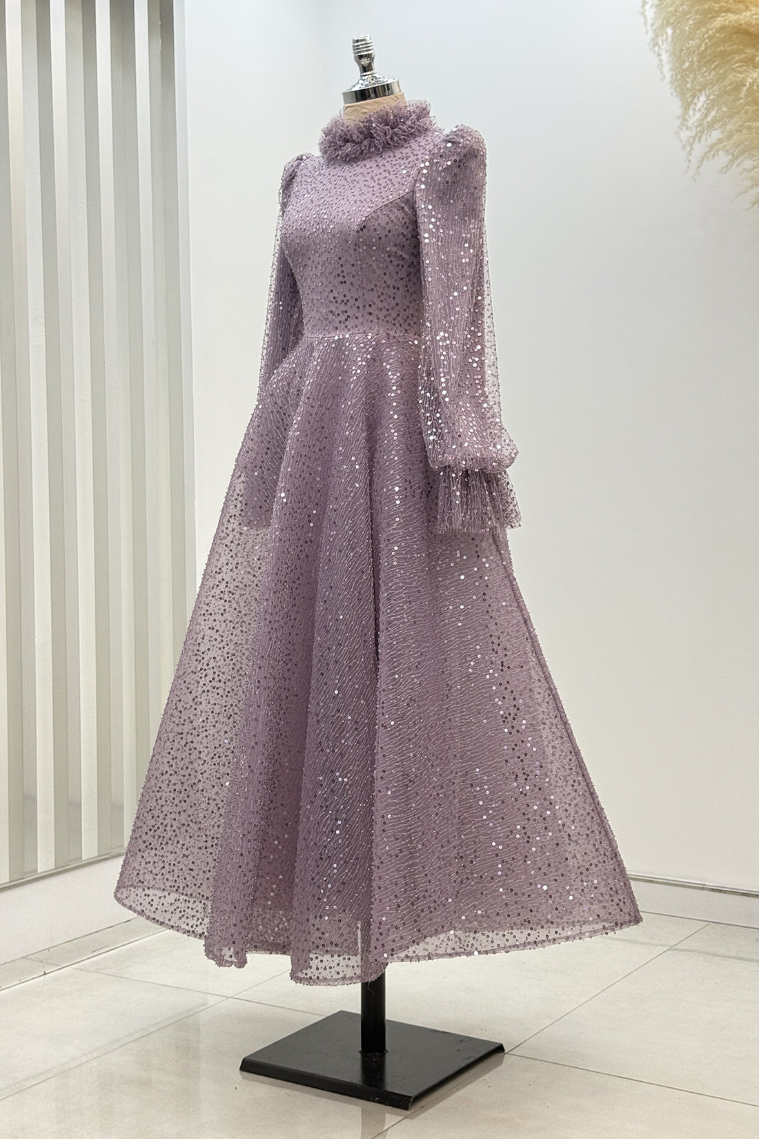 Midi Boy Boncuklu Kabarık Larin Abiye - Lila