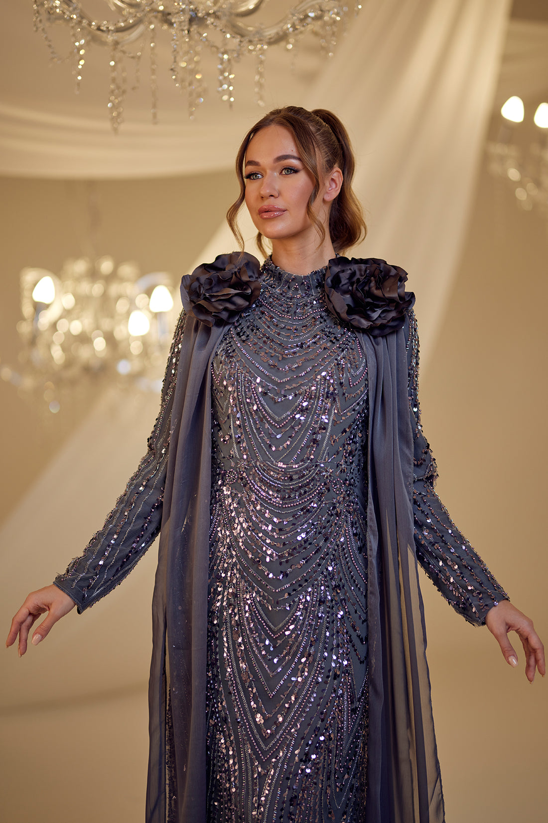 Boncuklu Çiçek Detay Mihrimah Abiye - Antrasit