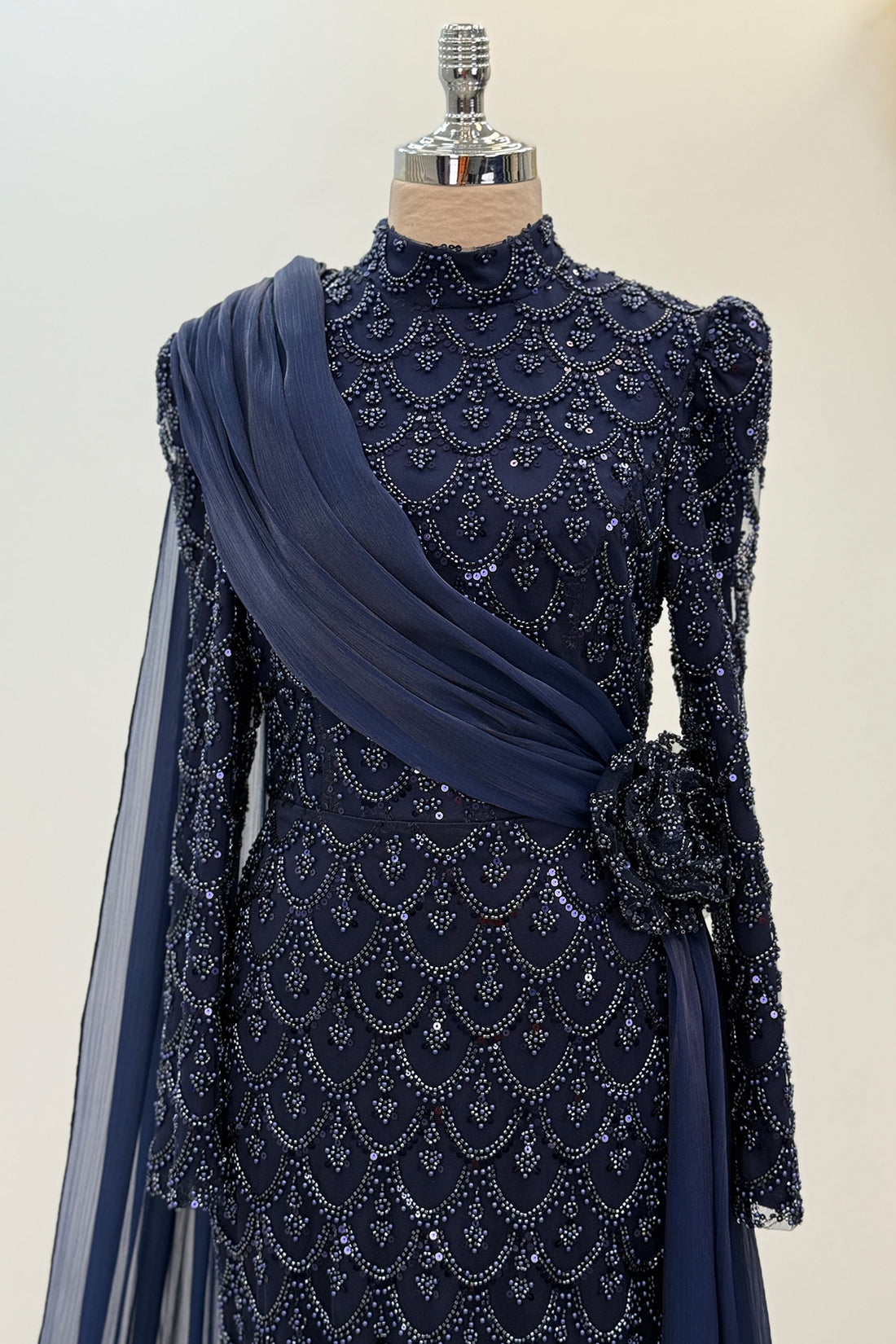 Şifon Pelerin Detay Boncuklu Milena Abiye - Lacivert